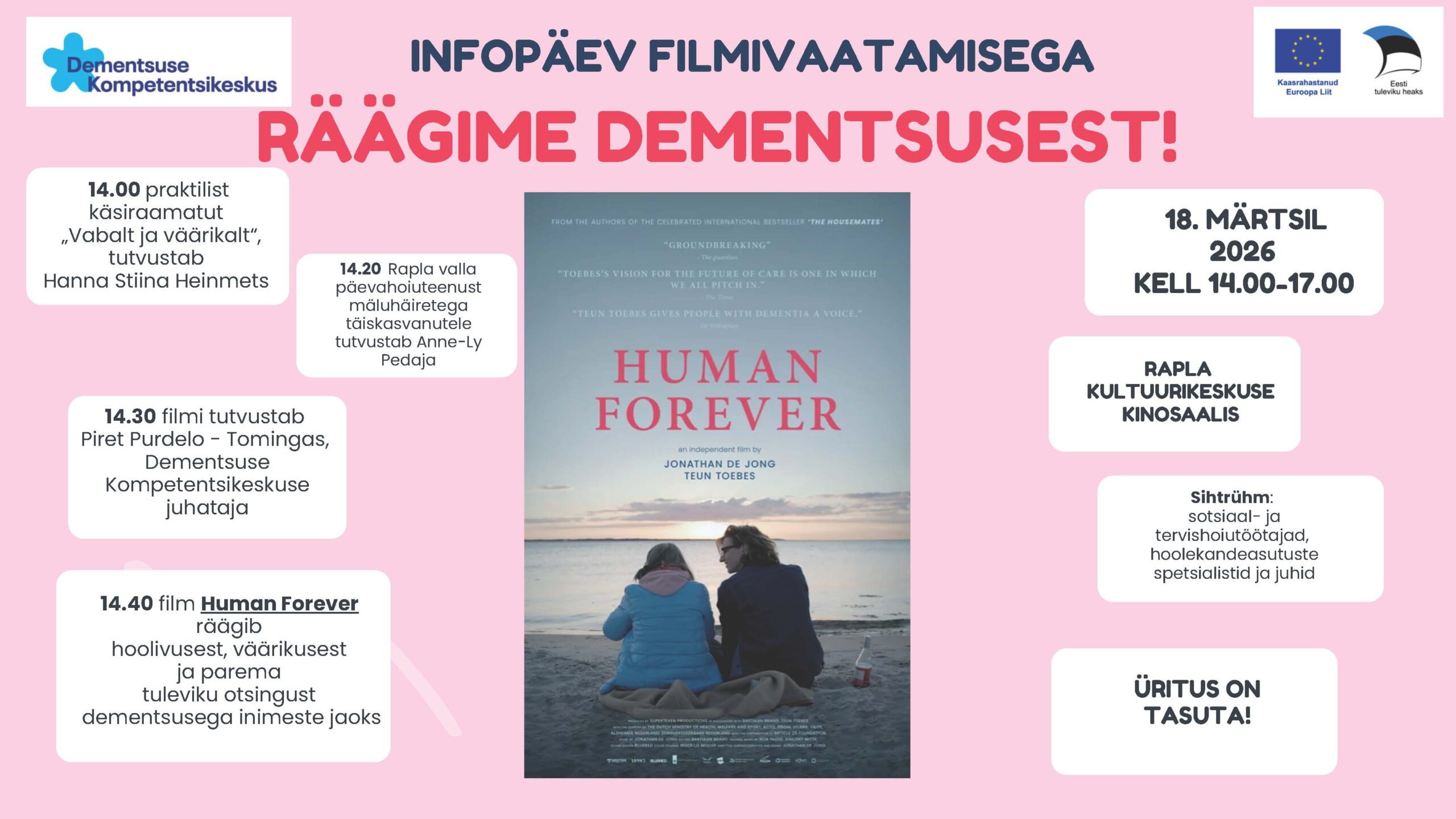 Ürituse raames tutvustame ka praktilist käsiraamatut „Vabalt ja väärikalt“, mis annab juhiseid dementsusega inimeste toetamiseks, vältides liigselt füüsilist või ravimitega sekkumist ning pakkudes inimlikumaid ja väärikamaid lahendusi hoolduses.